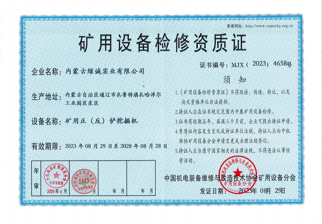 2018年我公司通過中國機電裝備維修與改造技術(shù)協(xié)會礦用設(shè)備分會審核并取得了9項礦用設(shè)備檢修資質(zhì)證書。公司本著“誠信為本 質(zhì)量為先 全心全意為客戶 ”的服務(wù)理念,圓滿完成各個廠礦的機械維修及配套服務(wù),期待與您共同合作。